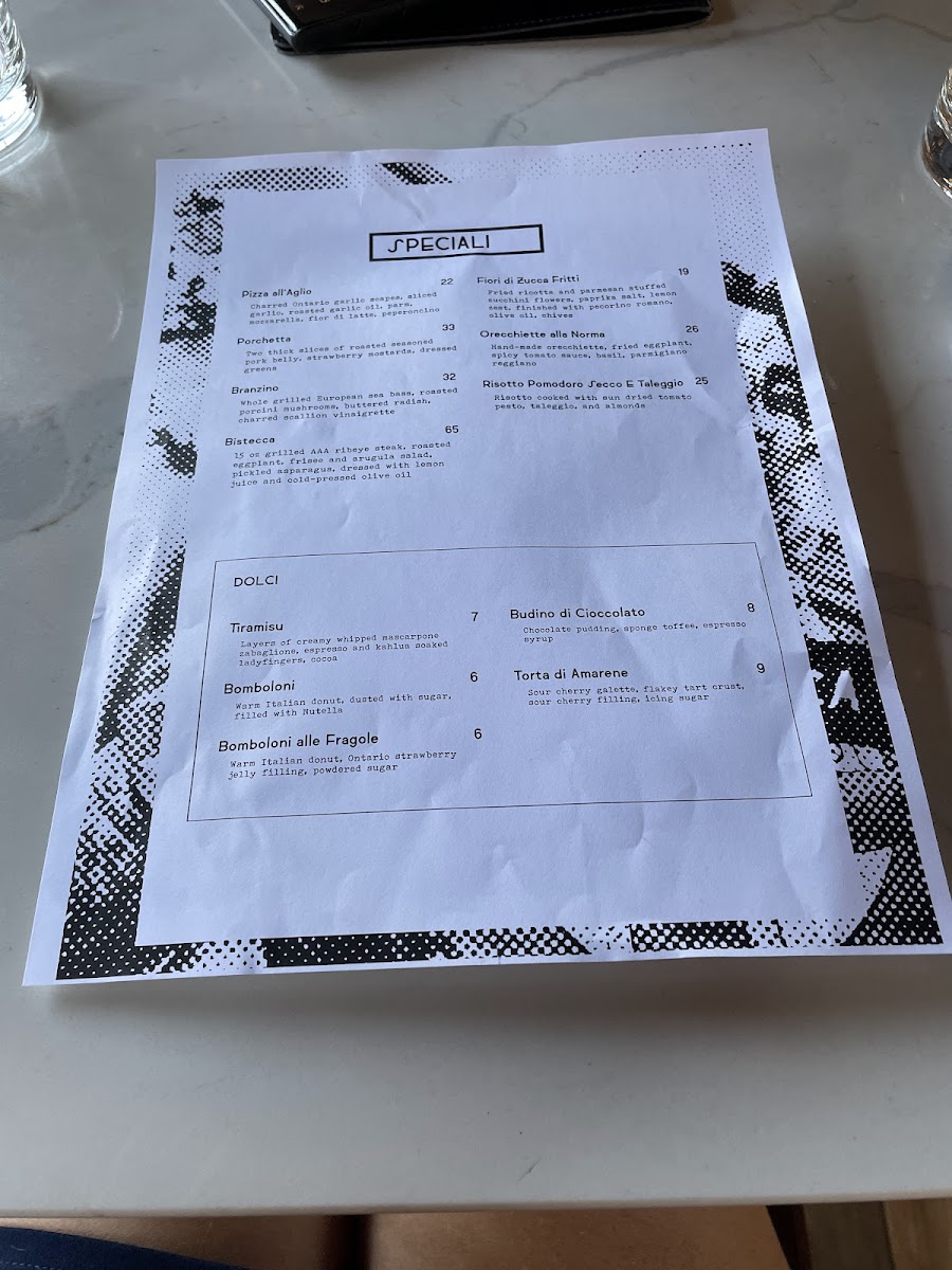 The Dolci section presents desserts including classic Italian sweets such as Tiramisu, warm bombolone donuts with various fillings, spiced rice pudding (Budino di Riso), and panna cotta.