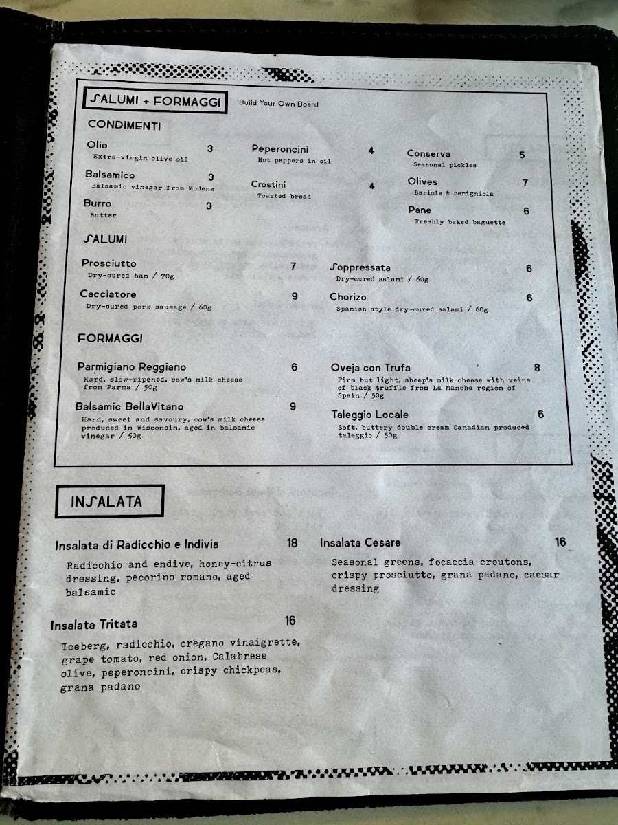 The menu at CIMA Enoteca features a variety of Italian dishes organized across several key categories. Guests can explore a selection of fresh salads under Insalata, including options with radicchio, endive, and seasonal greens paired with vinaigrettes and traditional Italian cheeses. The Antipasti section offers appetizers such as crispy fried artichokes with garlic dip, fire-roasted shrimp with Calabrian chili butter, grilled lamb skewers, housemade focaccia, and fried risotto balls (arancini).